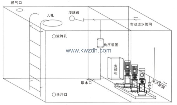 當自來水環(huán)網停水,水箱內水位下降到最低水位,自動停機;來水時,恢復正常運行。