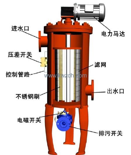 刷式自清洗過濾器反沖洗時(shí),靠慮刷在濾網(wǎng)表面旋轉(zhuǎn)將雜質(zhì)刷掉,并通過排污閥將污物排出。